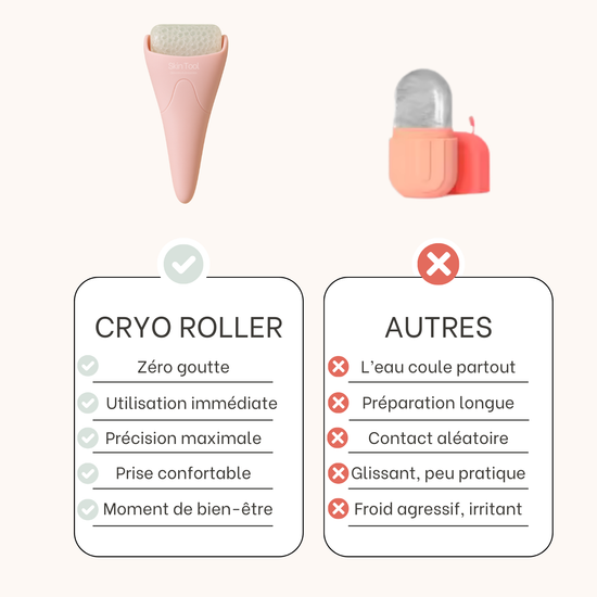 Notre Cryo Roller a été conçu pour remplacer ces méthodes artisanales, avec une technologie simple mais pensée pour la peau. À l’intérieur, ce ne sont pas des glaçons en contact direct avec ta peau, mais des microbilles de gel rafraîchissant. Résultat ? Le froid est stable, diffusé en douceur, sans jamais agresser la barrière cutanée.